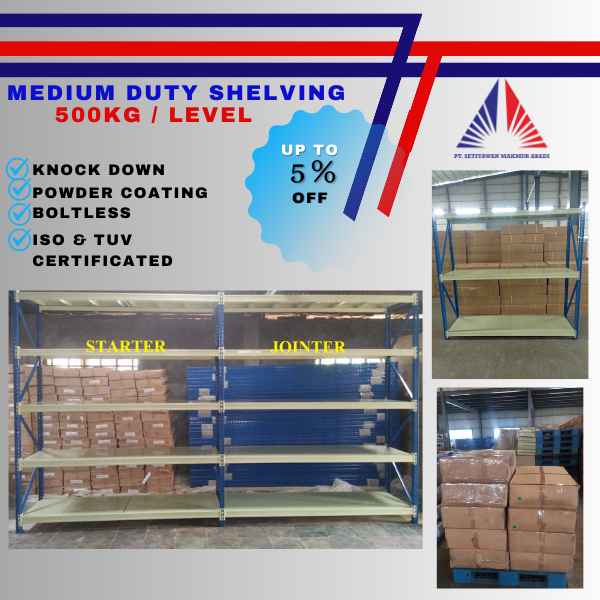 Untuk Penyimpanan sampai dengan 500Kg – 1000 kg, Rak Penyimpanan Gudang Mid Duty Tipe DC-50 & DC-70 adalah salah satu yang paling banyak dicari dan salah satu penjualan terbaik kami. Rak ini banyak sekali digunakan dalam bidang industri, komersil dan bidang lainnya. Rak gudang DC-70 bisa diaplikasikan untuk pergudangan pabrik, kantor, ataupun instansi-instansi lain, tersedia dalam beberapa pilihan warna dan ukuran, beam dan tingkat shelf dapat disesuaikan dengan permintaan customer, lapisan akhir menggunakan powder coating yang membuat Rak menjadi lebih awet dan tidak akan mudah berkarat.
